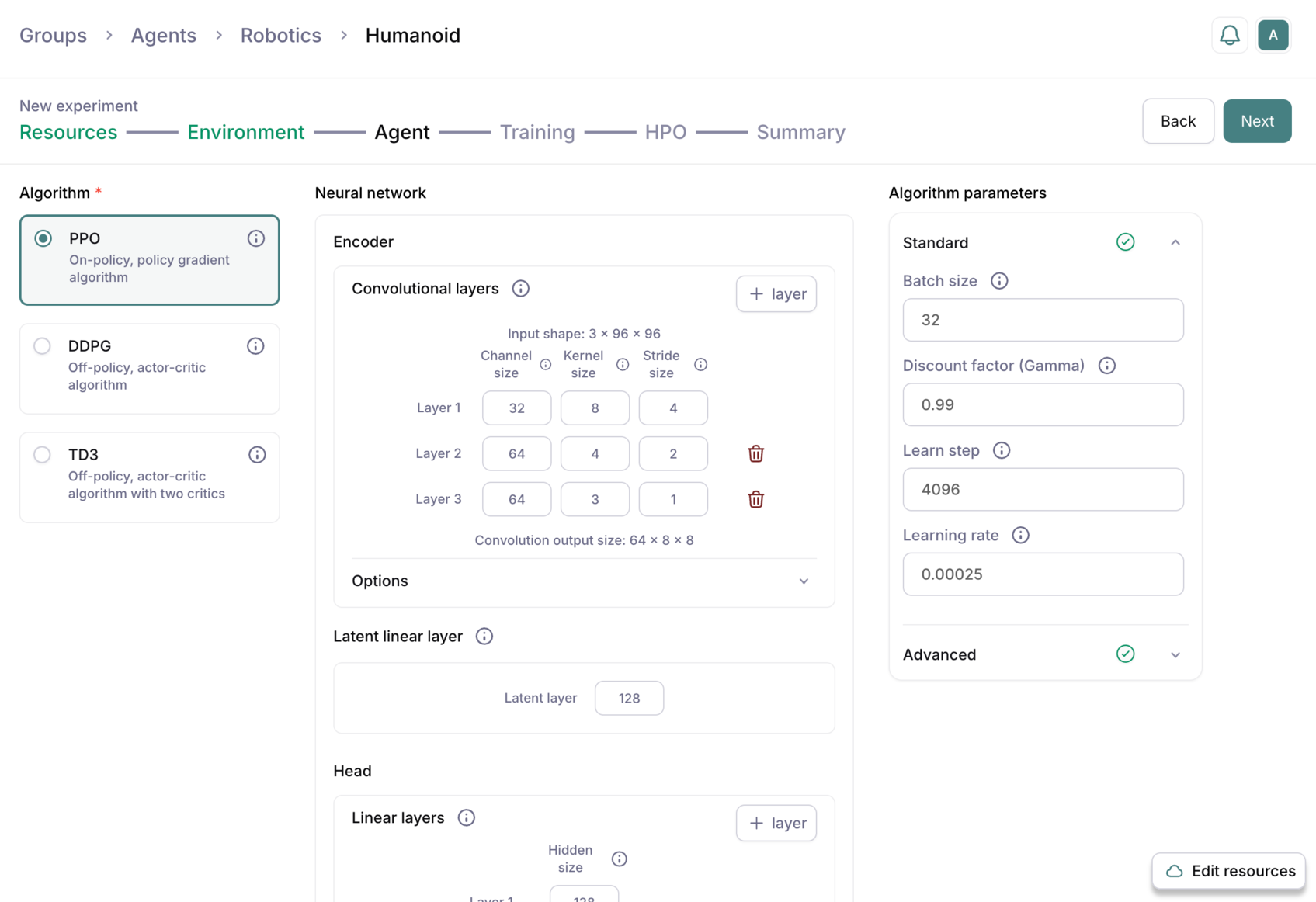 Select algorithms, rewards, constraints, and objectives; enable evolutionary tuning to explore promising configurations automatically.